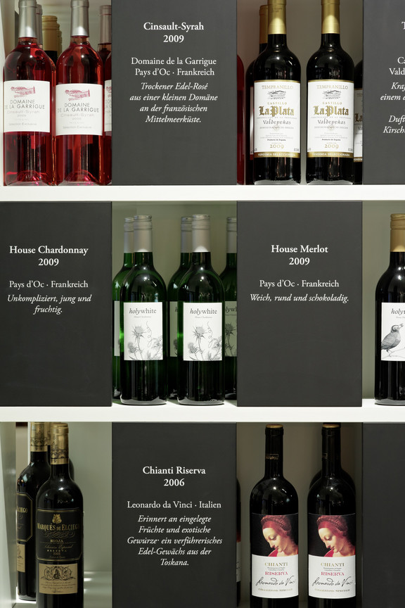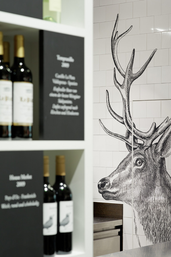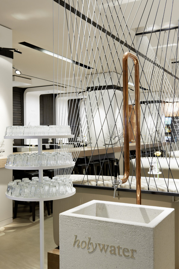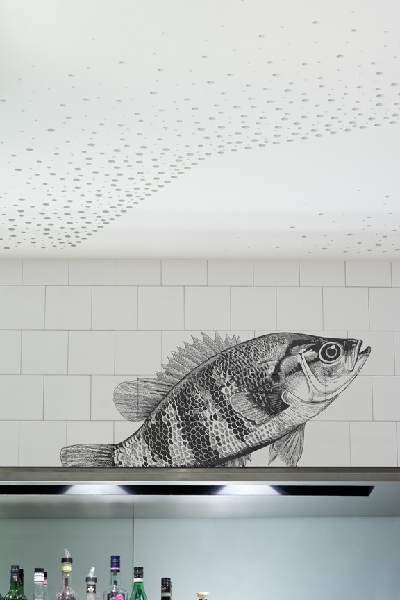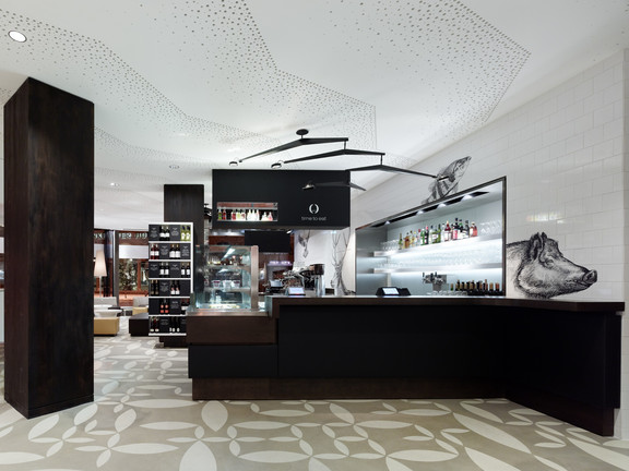 Das Restaurantkonzept wird komplettiert durch einen Take-Away-Bereich. Er hat einen separaten Eingang und ist von der Lounge durch ein Glasregal getrennt. So kann dieser Bereich zwar unabhängig funktionieren, ist aber doch gefühlter Teil des Gesamtraumes. Hier sind spiegelnde Kühlvitrinen in die zur Bar führenden Fliesenwand eingelassen. Das Glasregal mit vorgelagerten Körben bietet darüber hinaus vielfältige Möglichkeiten zur Warenpräsentation in beide Richtungen, für das Take-Away wie für das Merchandising im Restaurant. Viel Wert wurde auf eine gute Akustik im Gastraum gelegt. Sie wird durch eine speziell angefertigte Akustikdecke mit geometrisch gemusterter Lochung gewährleistet. Sie bildet ein attraktives Gegenspiel zum durchlaufenden rohen Estrichboden, der durch sein florales Muster zu einem der Key Visuals des neuen Restaurants wird.