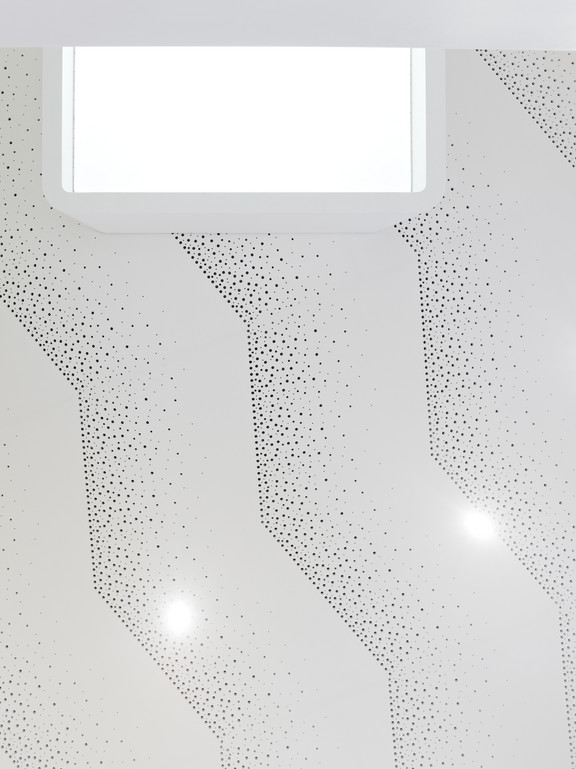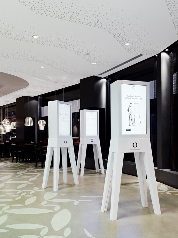 Der Gast erlebt eine präzise Choreografie, die ihn durch den Raum leitet. Er wird von einem weißen, auf einer Vielzahl unterschiedlicher Tischfüße schwebenden Tresen empfangen. Das leuchtende Deckenelement darüber markiert die Station als Dreh- und Angelpunkt des Raums. Daneben warten Terminals mit großen Touchscreens in weißen, etwas anthropomorphen Stahlblechgehäusen auf die Bestellung der Gäste. Mit ihren vier Beinen spannen sie ein Assoziationsfeld von einer ihre Dienste anbietenden Servicekraft bis zu alten freistehenden Möbeln auf.
