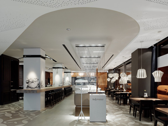 Möglich wird dies durch ein ausgeklügeltes Bestellsystem. Geordert wird an 10 Touchscreens im Eingangsbereich, die das Angebot in Bildern und Filmen visualisieren. Der Gast nimmt einen elektronischen Signalgeber mit an seinen Platz, der ihm signalisiert, wenn das Essen zur Abholung an einer zentralen Ausgabe bereit ist. holyfields ersetzt so das Warten in der Schlange durch das Genießen am Tisch. Die neue Restaurantkette adressiert ein urbanes Publikum, das seine begrenzte Essenszeit maximal ausnutzen möchte bzw. großen Wert auf Design und Ambiente legt. Entstanden ist ein lebendiges, unverwechselbares Restauranterlebnis mit warmer Atmosphäre und einer differenzierten, haptisch erfahrbaren Materialwelt.