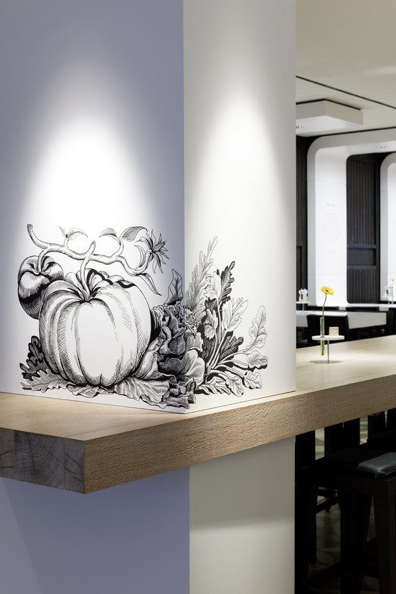 Dem Empfang beigeordnet ist ein Brunnen aus weißem Terrazzo, an dem sich die Gäste kostenlos Trinkwasser zapfen können. Weiterhin wartet hier eine separate Bar, an der man unabhängig von der Essensbestellung Getränken und Desserts ordern kann. Die Bar mit ihrem Tresen aus dunkel gebeizter Eiche und der mit schwarzem Leder bespannten Front bildet einen schönen Kontrast zur Rückwand aus weißen Fliesen. Diese sind mit Tiermotiven bedruckt, die an alte Stiche erinnern. Die Bar öffnet sich nicht nur zum eigentlichen Gastraum, sondern bewirtschaftet gleichzeitig eine kleine Lounge auf der anderen Seite des Empfangstresens, die zum gemütlichen Abschluss des Essens oder auf einen Kaffee zwischendurch einlädt. Sie besteht aus einem modularen System aus Sesseln und freien Poufs in verschiedenen warmen Lederfarben, die durch Beistelltische mit integrierten Textilleuchten komplettiert werden.