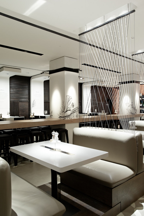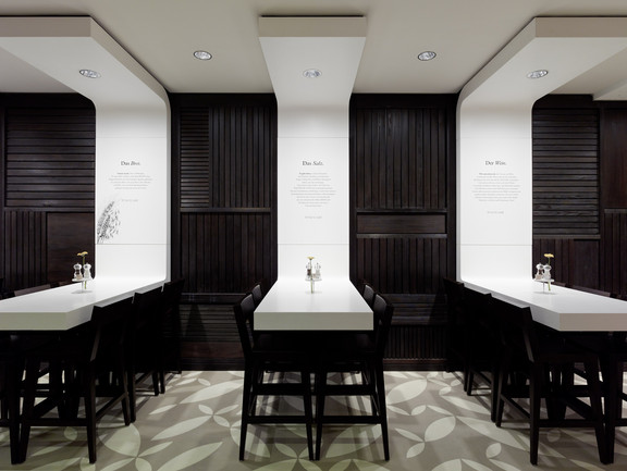 Der Gastraum bietet ein differenziertes Sitzplatzangebot, das den Gästen, je nach ihren Bedürfnissen, unterschiedliche Möglichkeiten anbietet. Die Plätze sind von der Fassade bis zur Rückwand in vier Ebenen aufgeteilt und in der Höhe gestaffelt. An den Fenstern befinden sich Holztische mit vier Stühlen, die eine klassische Restaurantsituation beschreiben. Eine abgehängte, eigens gestaltete Pendelleuchte schafft hier die gewünschte Intimität. In der nächsten Schicht steht leicht erhöht eine Reihe weißer Tische mit komfortabel gepolsterten Zweierbänken. Die fünf Tischgruppen werden durch ein Podest aus dunklem Holz am Boden sowie die weiche abgesenkte Decke darüber gefasst. Ein Geflecht aus abgespannten Gummilitzen separiert die einzelnen Tische, ohne die freie Sicht durch den Gastraum zu unterbrechen. In der darauffolgenden Ebene findet der Gast einen zwischen die Stützen gespannten Stehtisch aus geweißter Eiche als umtriebigsten Platz im Restaurant. An der mit dunklem Holzbalken gestalteten Rückwand schlussendlich stehen schlussendlich vier weiße Sechsertische auf gleicher Höhe wie die lange Tafel. In ihrer großen U-Form bilden sie den Abschluss der Inszenierung und eine Art Rückgrat des Gastraums. Von hier bietet sich aus einer eher zurückgezogenen Position der beste Überblick.