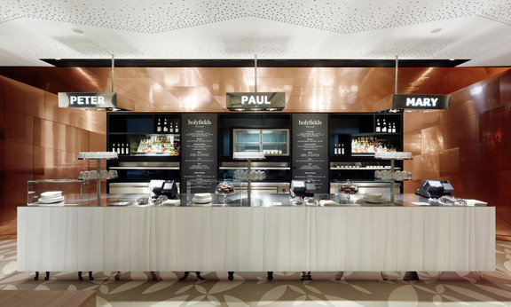Die offene Raumstruktur macht das Ende der Längsachse des Restaurants bereits vom Eingang sichtbar, wo sich vor dem Küchenbereich die Essensausgabe befindet. Sie wird durch eine trichterförmig zulaufende raumhohe Kupferwand sehr prominent markiert. Davor ist ein Edelstahltresen platziert, dessen Front mit der Faltung eines weißen Tischtuchs bedruckt ist, während der spiegelnd ausgeführte Sockel wieder das Motiv der unterschiedlichen Tischbeine vom Empfangstresen aufnimmt. Die Ausgabe wirkt so mehr wie das Buffet bei einer Feier, als wie eine klassische Ausgabe. Das Überreichen des Essens wird hier zelebriert. Durch die Öffnungen der Durchreichen und die Glasrückwände des Rückbuffets bekommt der Gast eine Ahnung vom Treiben in der dahinterliegenden Küche. Nochmals betont wird dieser Punkt in der Fernwirkung durch drei Leuchten an der Decke, die in ihrer Form an Flughafenanzeigen erinnern und den jeweiligen Ausgabetresen darunter mit ‚Peter‘, ‚Paul‘ bzw. ‚Mary‘ benennen. Der Gast bekommt für seine Bestellung den Namen des jeweiligen Tresens auf seinen elektronischen Signalgeber übermittelt und kann sich so gezielt sein Menü abholen.