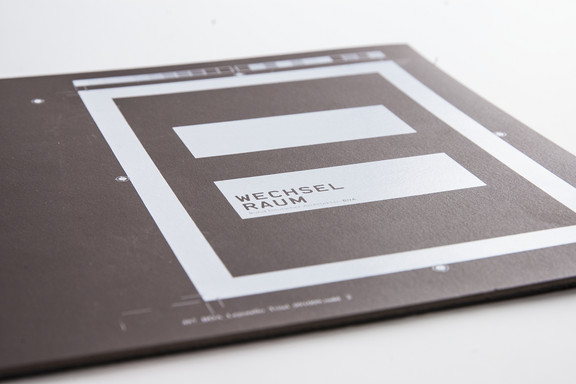 Die klare, markante Raumgeometrie stand Pate für das Gestaltungskonzept des Erscheinungsbilds. Der abstrahierte Grundriss des Raumes bildet ein robustes Raster für die Gestaltung aller Kommunikationsmedien – der Grundriss wird zum überdimensionalen Signet. Dieses Raster funktioniert als eine Art Container in der Gestaltung der Medien für alle Ausstellungen und Veranstaltungen.